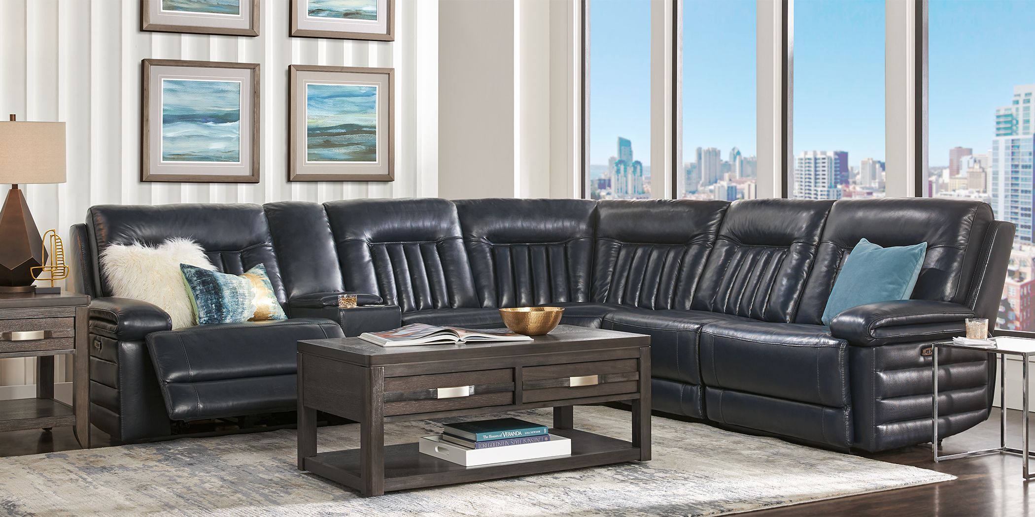 Camel brown or pearl white; Make the focal point of your living room or rec area a luxurious blue leather sectional! Perry leather 7 piece power reclining modular sectional. Just check the color options on the page, they are located under product description, just like in the example below. Create a cool color scheme in your living room with a blue sectional.